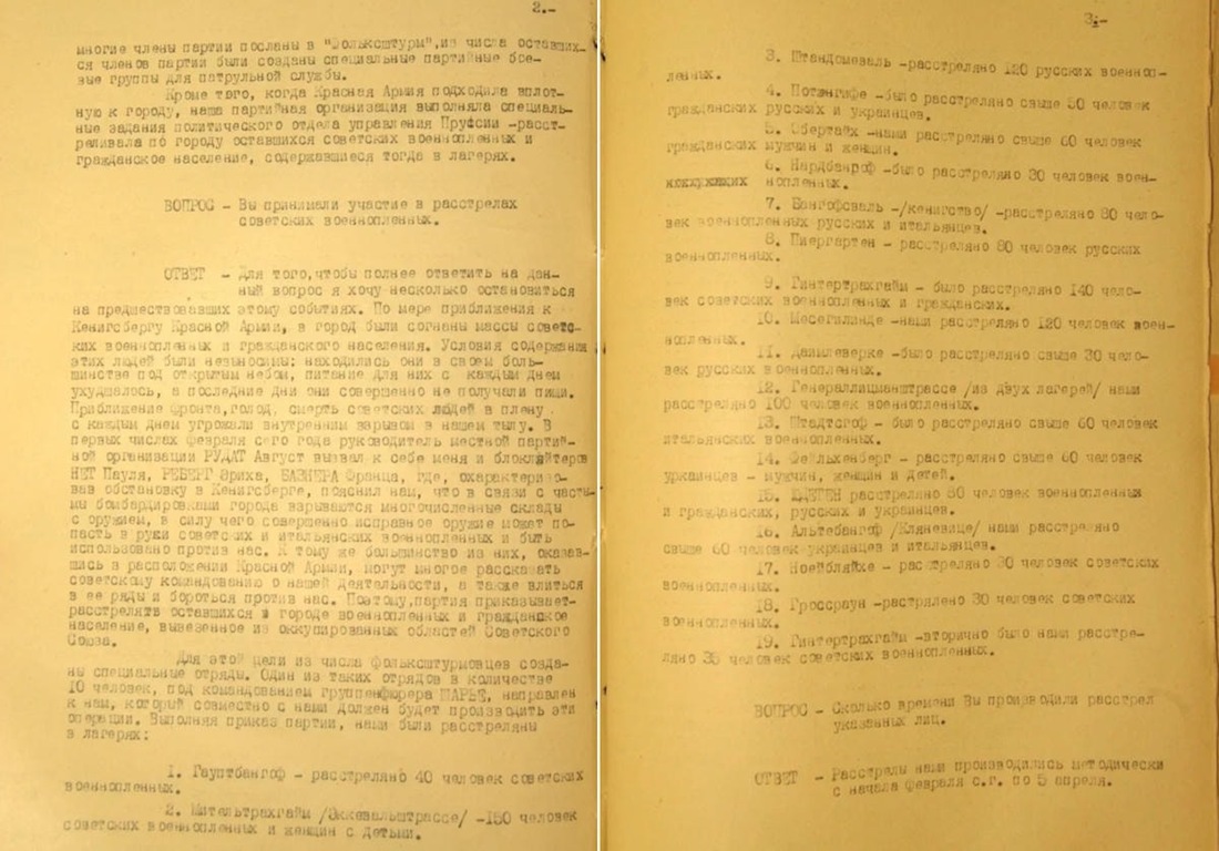 «Когда Красная армия подходила вплотную к городу, наша партийная организация расстреливала по городу оставшихся советских военнопленных и гражданское население, содержавшееся тогда в лагерях», — показал Машон.